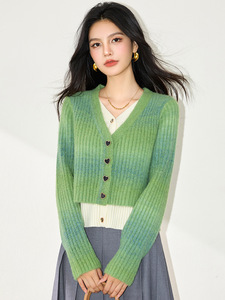实拍◆2025绿色假两件v领针织衫花纱毛衣秋季女气质慵懒风上衣