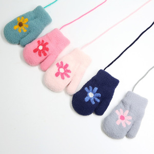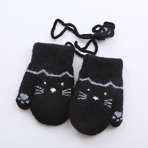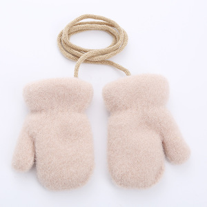 儿童手套连指针织水晶卷毛柔软男女宝宝防丢绳保暖纯色款