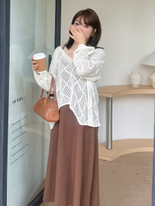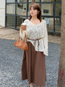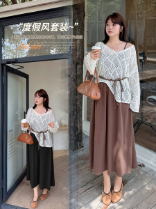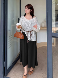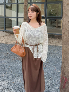 波西米亚风镂空针织罩衫套装2025秋胖mm吊带裙两件套313022T22