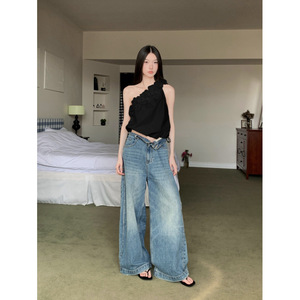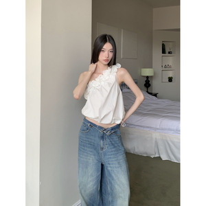 斜肩花朵褶皱露肩挂脖花苞背心上衣