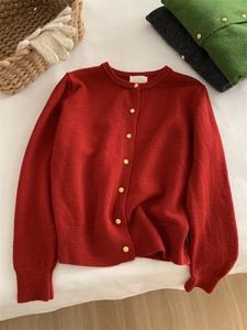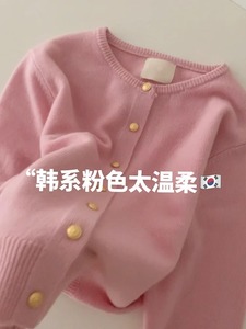 显白树莓粉小金扣针织开衫女秋冬韩系软糯加厚保暖圆领毛衣外套