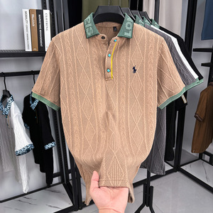 针织衫刺绣图案拼色短袖t恤男秋季中年时尚提花上衣男士休闲批发