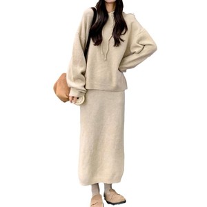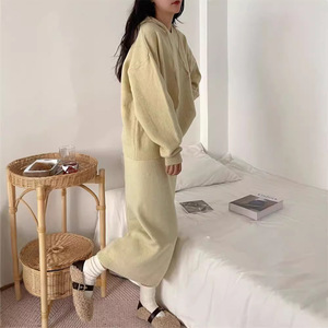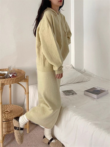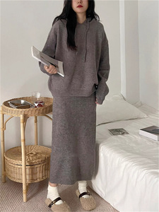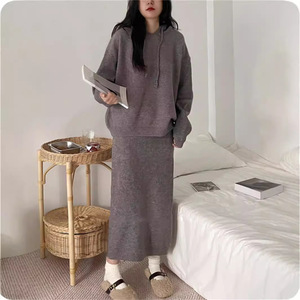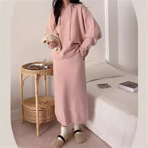 日韩绵羊绒加厚连帽套装2025秋季新款毛衣中长款半身裙两件套