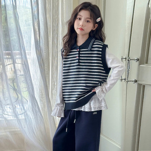 女童秋装套装2025新款儿童韩系超好看中大童针织马甲打底衫两件套