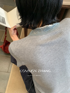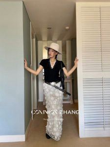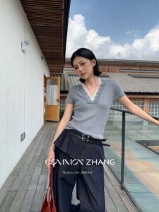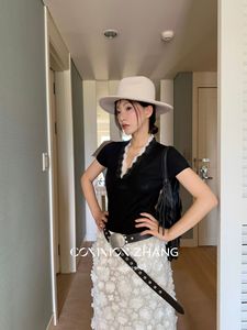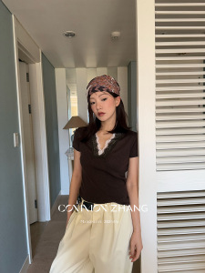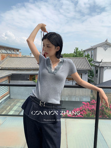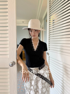 CZ ZHANG秋法式蕾丝拼接V领短袖针织T恤女短款修身针织衫B35297