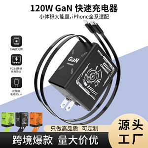 跨境新款120W快充氮化镓充电头自带双伸缩线type-c适用于华为苹果