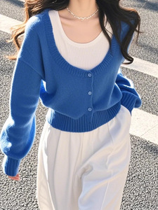 减龄上衣蓝色假两件针织衫女秋季新款今年流行的漂亮小衫