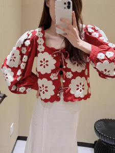 法式SA家25早秋新品甜美重工刺绣花卉系带V领泡泡袖上衣高腰半裙