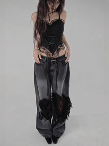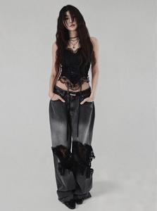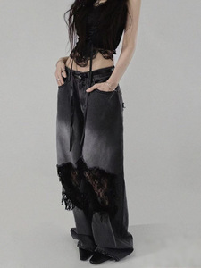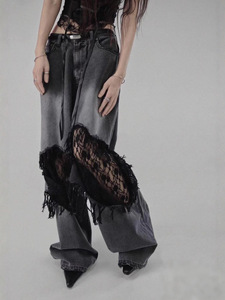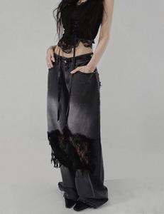 梵思羽韩国专柜同款时髦拼接破洞网纱蕾丝直筒牛仔裤女辣妹阔腿裤
