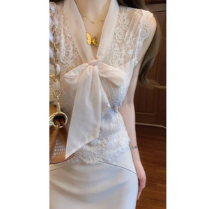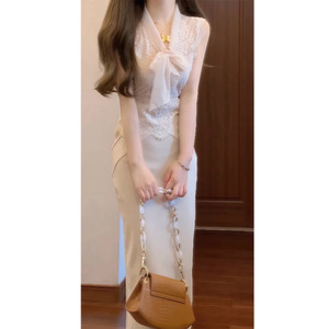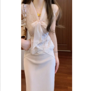 温柔姐姐风情万种纯欲蕾丝无袖蝴蝶结上衣包臀半身裙套装女两件套