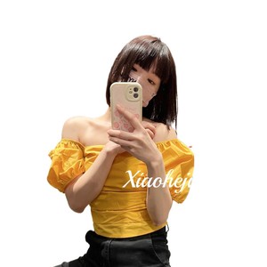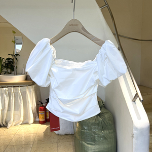 法式白色方领衬衫短袖t恤女夏泡泡袖辣妹露肩锁骨纯欲短款上衣服