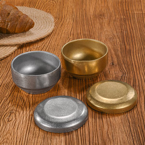 复古304不锈钢米饭碗带盖韩式双层防烫汤碗商用做旧金色料理小碗