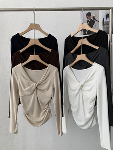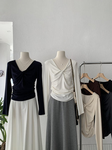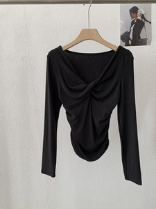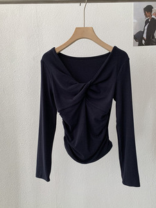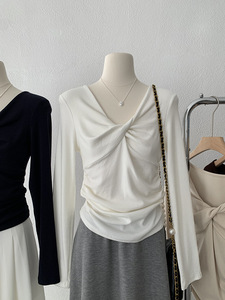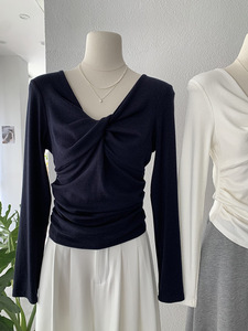 欧玛莱 V领扭结设计感纯色修身显瘦长袖打底衫T恤初秋新品女 4339