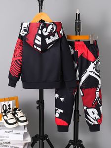 跨境INS婴幼小童男宝宝春秋款抓绒恐龙印花连帽长袖上衣长裤套装