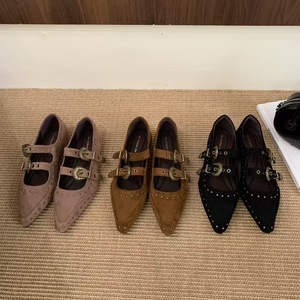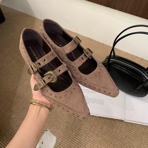 复古新款休闲百搭尖头内增高3cm绒面玛丽珍鞋铆钉一字带浅口
