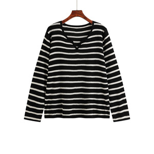 大码v领半开胸长袖针织衫2025秋款胖mm宽松显瘦条纹衫女上衣23219