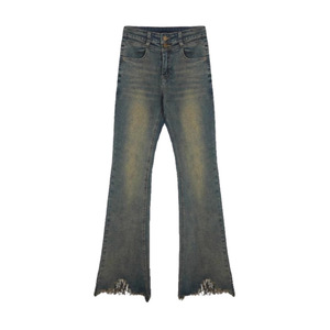 双扣流苏水泥灰微喇牛仔裤女潮流百搭春秋款高腰毛边怀旧拖地长裤