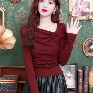 安可拉红褶皱长袖T恤2025修身韩版新款显瘦百搭秋季打底上衣