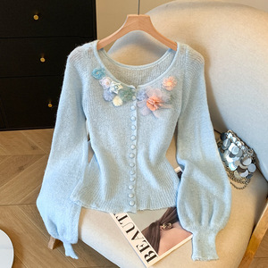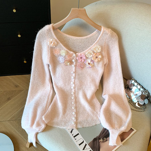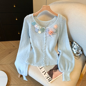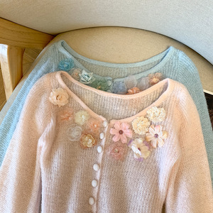 甜美立体花朵长袖针织开衫女秋季穿搭设计感气质修身内搭软糯毛衣