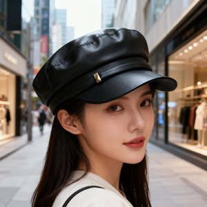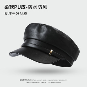 新款PU皮八角帽女秋冬款报童画家海军帽子英伦复古百搭鸭舌贝雷帽