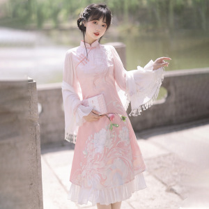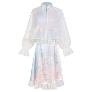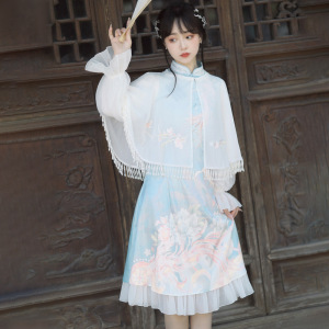 原创设计新款霏花鱼影中国风复古日常汉元素披帛旗袍两件套8345
