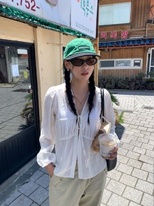 广州黄峥韩版秋季小衫女设计感系带v领泡泡袖褶皱衬衫上衣530775