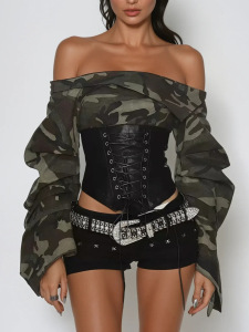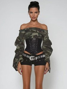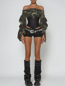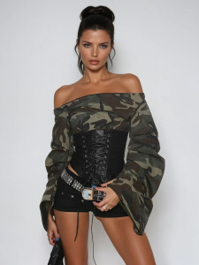 露肩一字领迷彩印花绑带上衣女|欧美新款皮质束腰显身材潮流时尚