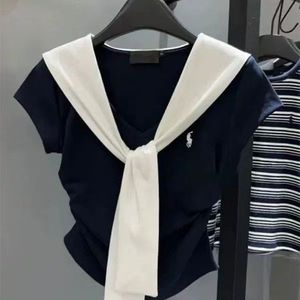 海军领正肩短袖t恤女2025夏季新款修身假两件披肩设计感小众上衣
