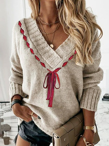 外贸跨境欧美亚马逊源头厂家 针织V领丝带套头毛衣春秋