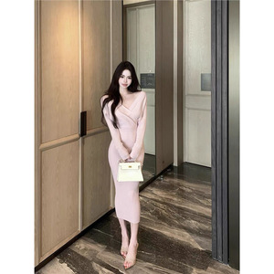 纯欲风交叉v领针织连衣裙女秋冬长袖修身中长款粉色收腰包臀裙子
