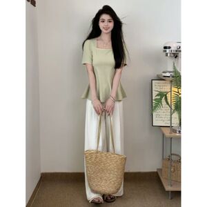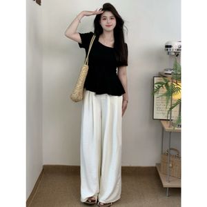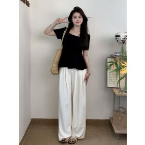 2025小红书爆款夏季微胖正肩荷叶边短袖T恤显瘦上衣奶皮裤温柔套