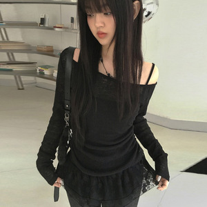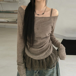 韩系甜美斜肩蕾丝拼接抽褶显瘦长袖T恤简约纯色修身日常休闲上衣