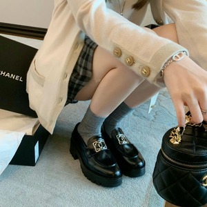 牛皮~葡萄妈同款双C金扣真皮乐福鞋女厚底英伦风一脚蹬懒人小皮鞋