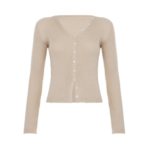 欧美新款纯色气质优雅风排扣针织T恤跨境时尚高级感V领长袖上衣