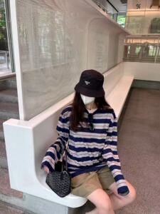 现货高版本miu家宽松百搭长袖t恤女条纹打底衫上衣ins时尚慵懒