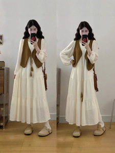 大码女装早秋新款长袖连衣裙套装马甲文艺宽松显瘦套装