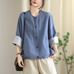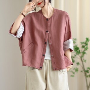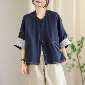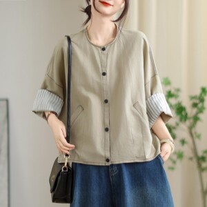 古咖服饰秋季纯色简约亚麻短外套女宽松遮肉短款显瘦纯色上衣