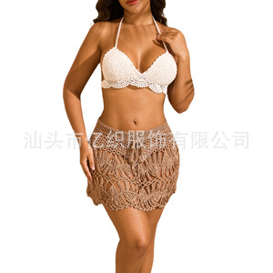 亚马逊外贸欧美手工钩针比基尼套装沙滩泳衣泳装沙滩裙三件套罩裙