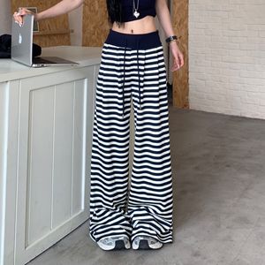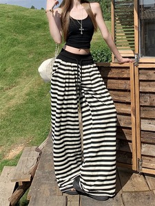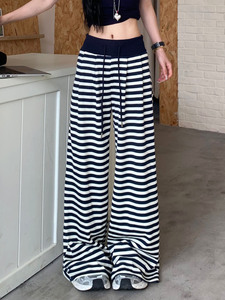 黑白条纹运动裤子女2025秋季新款高腰宽松显瘦休闲阔腿拖地裤ins