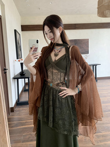 实拍 初秋复古森系蕾丝吊带连衣裙收腰围脖长裙+百搭喇叭防晒开衫
