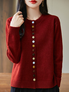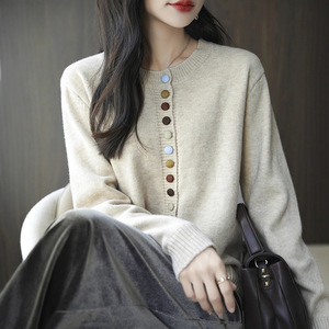 圆领毛衣开衫外套女秋季女装彩色扣子撞色文艺范宽松百搭针织上衣