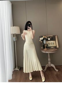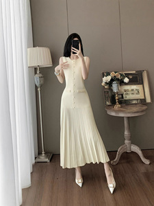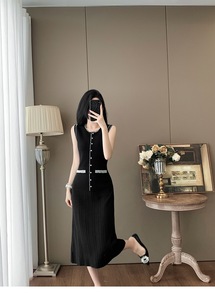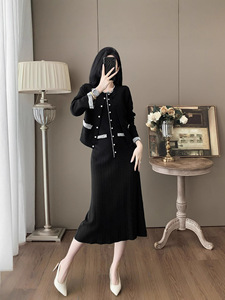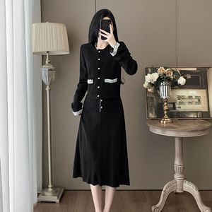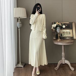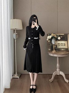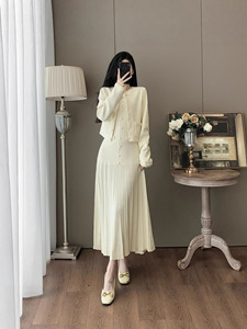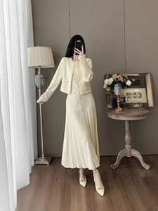 高端精致珍珠针织两件套2025年秋冬新款单排扣短款开衫背心裙套装