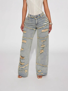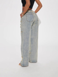 美式复古水洗做旧设计感脏破洞牛仔长裤女宽松阔腿重磅高街痞帅裤
