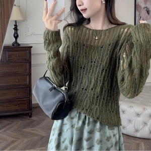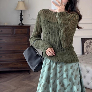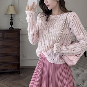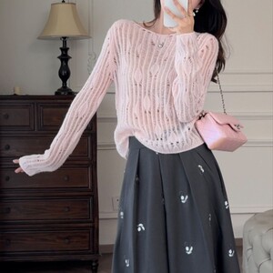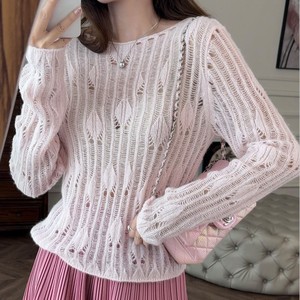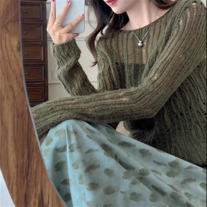 气质纯欲风宽松镂空圆领针织衫女韩版新款高级感薄款初秋长袖上衣