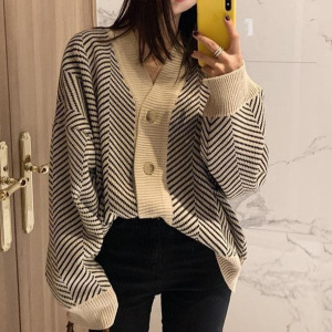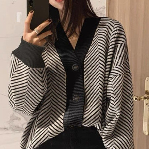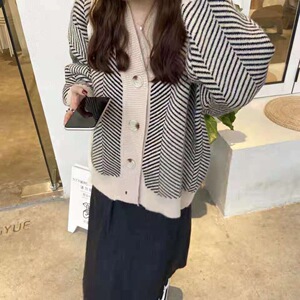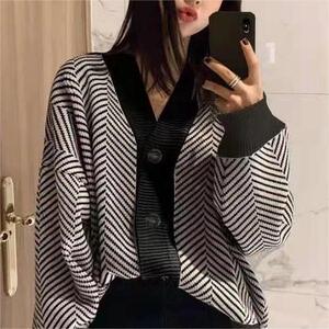 2025秋冬新款法式复古毛衣开衫女条纹针织衫上衣宽松慵懒风外套女