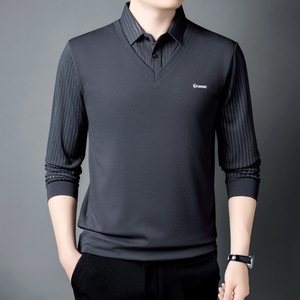 秋季中年男士长袖假两件t恤衫条纹宽松翻领中老年爸爸装休闲百搭