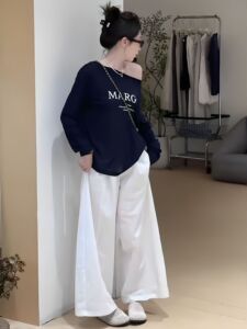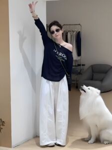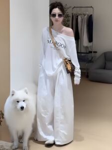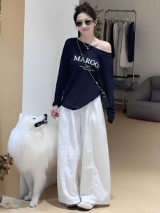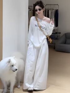 早秋松弛感穿搭一整套2025新款韩版字母印花一字肩上衣阔腿裤套装