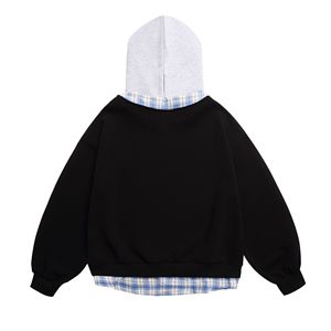 美式学院风假两件格子拼接连连帽外套男女秋季宽松情侣叠穿卫衣潮