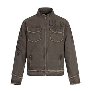 11KN美式复古牛仔夹克立领外套男女复古印花水洗拉链毛边做旧上衣
