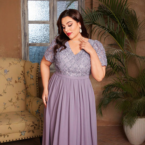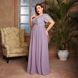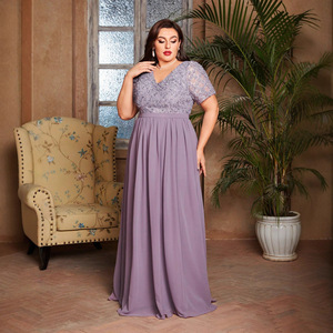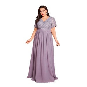 欧美女式优雅短袖V领连衣裙薄纱大码晚礼服速卖通新款修身长裙女